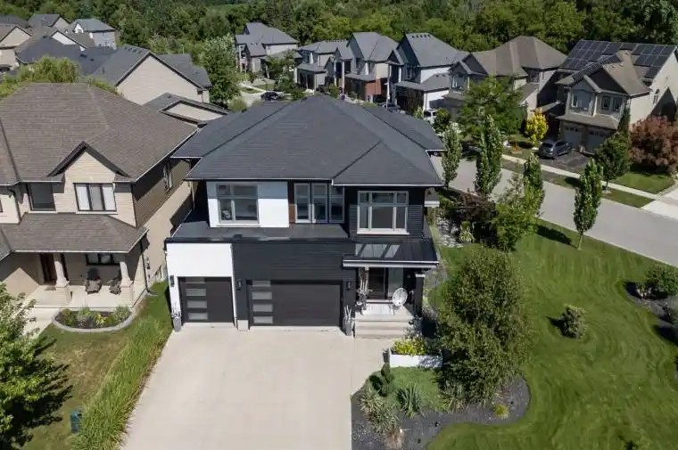 Luxury living redefined 10 min west of London. Tucked onto a quiet crescent, this extraordinary executive residence offers an enviable lifestyle with a premium lot and show-stopping resort-style backyard anchored by a heated saltwater pool with state -of-the-art automated safety cover (~25k), and year-round cabana retreat. Curated with smart home technology, every detail reflects thoughtful design and elevated finish. Modern curb appeal impacts with crisp black-and-white contrast, manicured landscaping, and a triple bay heated garage (fully insulated/epoxy flooring) plus six-car driveway. A dramatic two-storey foyer with glass-railed floating staircase and full-height windows creates a luminous entry. Wide-plank White Oak hardwood draws you to the airy great room and a sleek two-sided gas fireplace with a floor-to-ceiling stone surround that also serves the outdoor living space. The chef’s kitchen is striking and high-function, showcasing stone surfaces, a 4-seat island with wine fridge, programmable lighting, and premium stainless appliances. A dedicated home office, sleek powder room, and crisp designer lighting/paint tones elevate the main floor ambiance. Upstairs, the primary suite is a true retreat with a herringbone feature wall, tray ceiling, walk-in closet with custom built-ins, automated shades & a private glass-railed balcony. The spa-like ensuite offers radiant in-floor heat, luxe finishes. Three additional bedrooms each with hardwood flooring, solid-core doors, and motorized shades share the level with a well-appointed laundry room. The fully finished lower level offers an expansive recreation area, full bathroom + a home gym with glass enclosure and high-end audio. Outside, the cabana is an entertainers dream with integrated lighting, wet bar, beverage fridges, and 3-piece bathroom all framed by lush black cedar privacy hedging. A seamless blend of technology & design just minutes from Komoka Provincial Park & 11 km of trails along the Thames River.