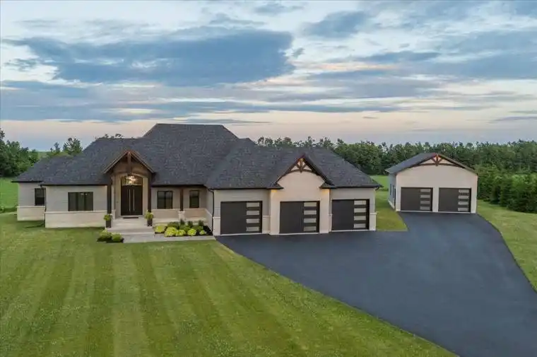 Tucked away on a quiet, prestigious court in Oro-Medonte is a home that captures what so many dream of,peace, space, and sunrises that take your breath away. This custom-built bungalow is more than just a house its a retreat. Set on an oversized double lot with open skies and forested views, it offers the rare luxury of serenity without constant upkeep. Enjoy sweeping views and the freedom to enjoy every inch of your land. You have the freedom to design the outdoor lifestyle you’ve always imagined from a resort-style pool and charming pool house to a custom play area, winter ice rink, or entertainers dream yard. This is a rare canvas where your vision can come to life. The elegant stone and stucco exterior is complemented by a triple-car garage, plus a detached 750 sqft 4-car garage with oversized doors and 100-amp panel. The detached garage is roughed-in for a 375sqft loft and the ultimate setup for toys, cars, or a dream workshop. Inside the home you’ll find over 4590sqft of finished living area, soaring 12-ft ceilings in the foyer and great room, 10-inch white oak flooring, and 8-ft solid core doors set the tone for luxury and comfort. The private primary suite features a spa-like 5-piece ensuite and a walk-in closet that feels like its own room. Two additional bedrooms share a 5-piece bath, while the mudroom/laundry space is perfect for family life. The covered porch was made for relaxing mornings with a stone fireplace, built-in TV, and flush-mount infrared heater. And in the basement? A golf lovers dream, your very own professionally custom-built state-of-the-art golf simulator. Endless friendly competition and movie nights too as this expansive space easily transforms into your own private home theatre. Along with a gym, a guest bedroom, a new 4-piece bath, and space for a future bar, and you’ve got the ultimate entertainment zone. 1 Best Court isn’t just a home it’s where luxury meets lifestyle, and every sunrise feels like the start of something beautiful.