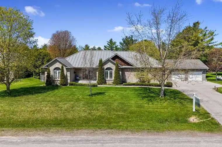 Surrounded by trees and set on a private lot, this executive bungalow delivers more than 3,000 sq ft of stylish living space designed for comfort, function, and fun. A durable metal roof, attached garage, and spacious backyard with its own pickleball court make this property both practical and impressive. Inside, the inviting front foyer opens to a bright, well-planned interior. The dining room shines with a peaked ceiling, large front window with California shutters, and chic board-and-batten wainscotting. The living room offers a sleek propane fireplace framed by windows, updated flooring, and generous space for family gatherings, all flowing seamlessly into the kitchen. The kitchen is a standout with dual-level prep counters, built-in stainless steel appliances, a ceiling-height pantry, glass tile backsplash, recessed lighting, and an undermount sink. Just beyond, the sunroom with its built-in window seat and walkout invites you to unwind with a book or soak up backyard views. The adjoining family room, complete with built-in shelving, adds an extra layer of warmth and versatility. The primary suite is a retreat of its own, offering a walk-in closet with custom cabinetry and a spa-style ensuite with a soaking tub and glass shower. Two additional bedrooms and a full bath provide flexibility, while a guest bath and main floor laundry room add convenience. The finished basement extends your living space with a large rec room, games area, and a versatile bedroom currently set up as a gym, ideal for a studio, office, or home-based business. Outdoors, the private yard backs onto woods and offers a deck, patio, fire pit with seating, and a pickleball court for year-round enjoyment. All this, just minutes from amenities and with easy 401 access, makes this property the complete package.