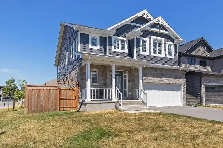 Welcome to this beautiful family home offering nearly 3,000 sq/ft of finished living space, 4 bedrooms, 3.5 baths, and a spacious corner lot in the desirable Woodhaven community. Step inside to a grand foyer leading to an open-concept main floor with 9ft ceilings and hardwood and tile flooring throughout. The gourmet kitchen features a large centre island with breakfast bar, stainless steel canopy range hood, tile backsplash, and a walk-in pantry, opening to the breakfast nook with patio doors leading to a fully fenced backyard complete with deck, stamped concrete patio, gazebo, and play structure. The bright living room offers large windows, pot lights, and a cozy gas fireplace, while a formal dining room, main floor office with double doors, and a mudroom with walk-in closet add style and functionality. The hardwood staircase leads upstairs where youll find four spacious bedrooms, each with hardwood flooring and walk-in closets. The luxurious primary suite includes a huge walk-in closet and spa-like 5-piece ensuite with freestanding soaker tub, glass-enclosed shower, and double vanity. One secondary bedroom has its own ensuite, while the others share a 4-piece bath. A convenient second-floor laundry room with sink and loft area completes this level. The full basement with 9ft ceilings and bathroom rough-in offers excellent potential for future living space. Additional features include a double garage with paved 4-car driveway, high-efficiency furnace, HRV, central air, air cleaner, security system, and five appliances included. Ideally located just steps from the new school and future park, and only minutes to west-end amenities. Flexible closing availablethis home truly has it all!