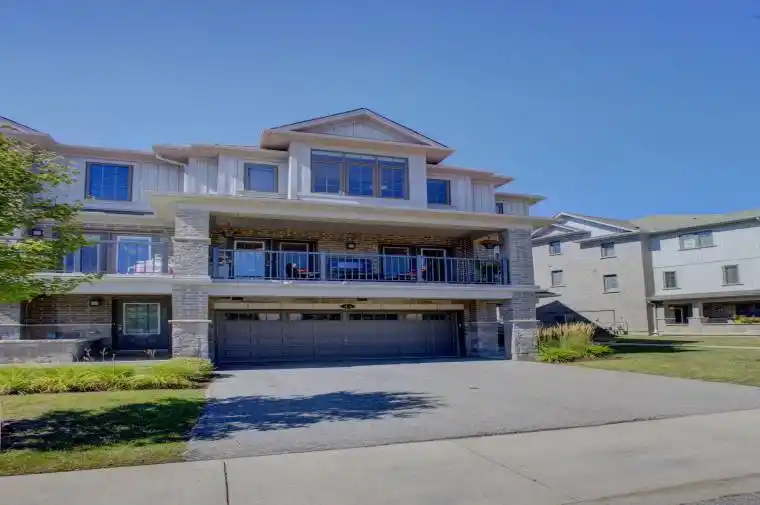 Executive end-unit townhome offering the perfect blend of style, space, and convenience. Move-in ready, this 3-bedroom, 3-bathroom home features quartz counters throughout, a rare double driveway, and a 2-car garage, setting it apart from the rest. Step inside to an open-concept main floor with a bright, modern design. The gourmet kitchen boasts an oversized quartz island with breakfast bar, tile backsplash, and stainless-steel appliances. Custom window coverings and tasteful finishes elevate every room. Two separate walkouts extend the living space, leading to a covered balcony complete with an electric fireplaceideal for morning coffee or evening relaxation. The welcoming foyer, accented with a decorative shiplap wall, adds both charm and functionality. Upstairs, you will find a convenient laundry room, two spacious bedrooms, and a luxurious primary suite with a walk-in closet and spa-like ensuite. Additional highlights include a garage door opener with remote, a newer furnace (2024) with warranty, washer and dryer (2023), and low condo fees covering exterior maintenanceperfect for investors, first-time buyers, downsizers, or snowbirds seeking worry-free living. Ideally located minutes from Conestoga College, scenic parks, walking trails, and top-rated schools, this home combines executive living with a low-maintenance lifestyle. Don’t miss your chance to own this turn-key gem in a prime location!