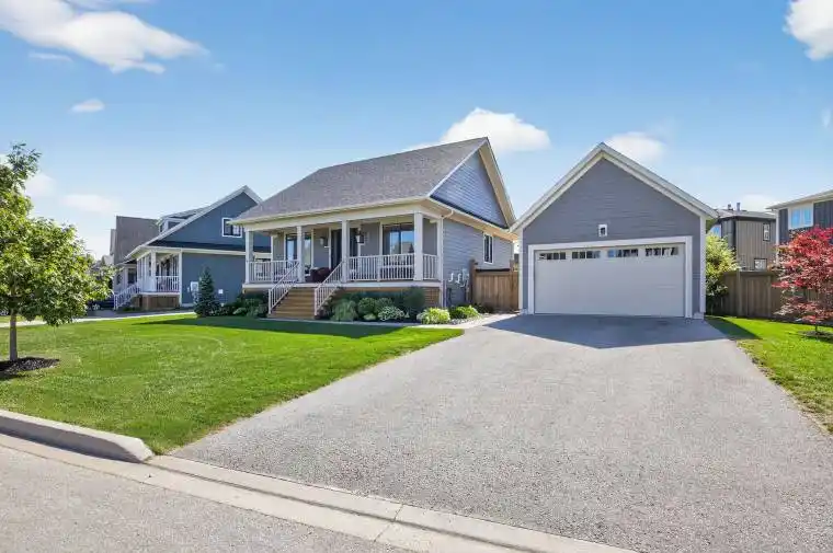 Welcome to 291 Yellow Birch Crescent in the coveted Windfall community, just minutes from Blue Mountain. This stunning 2 + 2 bedroom, 3-bath bungalow sits on a premium 100 frontage lot with captivating hill views, offering the perfect blend of luxury and year-round resort living. Step outside and embrace the outdoors – bike and hike the nearby trails, ski from just outside your doorstep, or swim in Georgian Bay. Residents also enjoy exclusive access to The Shed, Windfalls community hub with pools, hot tubs, and gathering spaces. The professionally landscaped grounds showcase inviting covered porches, a flagstone fire pit, and a hot tub with mountain views. The private, south-facing backyard is drenched in sun and includes green space ideal for children or pets. Inside, the open-concept main level impresses with soaring 14′ vaulted ceilings, a gas fireplace, and a stylish kitchen with quartz countertops and stainless steel appliances. The primary suite boasts a spa-inspired ensuite with glass shower and free-standing tub, while main-floor laundry adds everyday convenience. A thoughtfully designed in-law suite, accessible through a private keyless side entrance, features a full kitchen, stainless steel appliances, second gas fireplace, 2 bedrooms, 1 bathroom, and laundry hookups – perfect for extended family or rental potential. Additional highlights include a detached double-car garage, rare 4-car side-by-side driveway parking, and 2,235 sq. ft. of beautifully finished living space. Built in 2018, this move-in-ready home is an exceptional opportunity in one of the areas most sought-after communities.