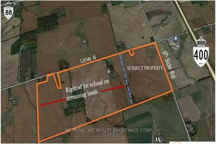 An extraordinary chance to acquire a legacy property in Bond Head. Spanning approx. 99.11 acres at the corner of 5th Sideroad and Line 6, this original family-held farm is a rare acquisition of scale and character, the kind that seldom becomes available. It offers both the presence of a landmark holding today and the promise of significant future opportunity as the area continues to evolve.The lands are free of Greenbelt restrictions, with only a small conservation portion at the rear, leaving nearly the entire acreage usable. Suitable for an estate residence, equestrian retreat, or simply as a strategic long-term investment, the property is also surrounded by major developers. Across the road, designated employment lands are now undergoing servicing, underscoring the future development horizon.The possibilities are further strengthened by a remarkable 25-year first right of refusal on approx. 201 adjoining acres, offering a rare pathway to expand and secure an even greater presence in the area. The seller is open to all reasonable offers and recognizes current market conditions. Attractive seller take-back mortgage options are available, making this both a distinctive acquisition and a forward-looking investment. Residence and lands are tenanted. Showings by appointment only. Buyer to verify all information and conduct their own due diligence.