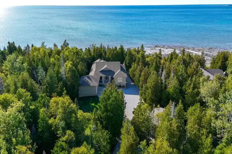 Breathtaking views, quality craftsmanship, and true pride of ownership! Set on a private 1.4-acre lot in a sought-after neighborhood, this well-maintained property features a gently curved driveway leading directly to the clean shoreline of Lake Huron. A dredged channel and L-shaped dock offer a protected harbour perfect for small boats, kayaks, or swimming. Relax under the timber framed pergola with Toja Grid sunshade and take in stunning sunsets by the water. The exterior boasts low-maintenance James Hardie siding and local Wiarton stone. With over 540 sq.ft. of decking – including durable, splinter-free Brazilian Ipe hardwood – there is plenty of space to entertain outdoors. Inside, a large foyer opens to an elegant living space with coffered ceilings, a stone fireplace, and Maple hardwood floors. The custom kitchen is characterized by the Titanium black granite countertops and Hubbardton Forge lighting fixtures. Form blends function with an induction cooktop, BI oven/microwave and plenty of storage. Step from the dining room onto a covered deck with a direct gas line for Barbeques or propane fire table. The main-floor primary suite offers water views, two walk-in closets, and a spa-like 5pc ensuite. A mud/laundry room connects to the attached garage for added convenience. The attached garage is fully finished with PVC lined walls. The walk-out lower level includes two spacious bedrooms, a 3pc bath, a large family room with in-floor heating, and a versatile workshop – ideal for hobbies or storage close to the lake. No shortage of storage space with the additional 24×24 detached garage added in 2020, plus a 8×12 storage shed. Additional features include central vacuum, central air conditioning, automatic whole home generator and water treatment system – all for comfort and peace of mind. 2885sq.ft., 3-bedroom, 2.5-bathroom home. First time on the market – this one-owner home invites you to enjoy peace, comfort, and natural beauty on the stunning Bruce Peninsula.