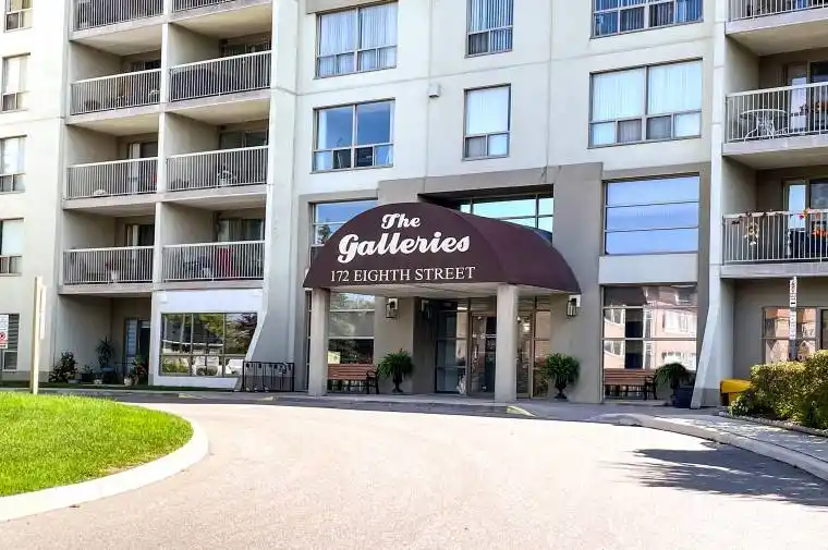 The Galleries. One of Collingwoods Sought-After Condominiums. This beautiful 2-bedroom, 1-bath condo offers stylish living in a prime location. This bright third-floor unit features hardwood floors in the living and dining areas, an updated bathroom, and a modern kitchen with newer cupboards, countertops, appliances, and backsplash. It’s move-in ready. Enjoy expansive southern views over Collingwood and beyond from the balcony, bedrooms and living room. The Galleries provides exceptional amenities, including a spacious and welcoming lobby with a concierge, underground parking, a main-floor storage unit, updated fitness and social rooms, and a guest suite. The condo fees include heat, air conditioning, water/sewer, and parking. Ideally located a short distance from shopping and near the Collingwood Trail system and public transit. Plenty of guest parking available.