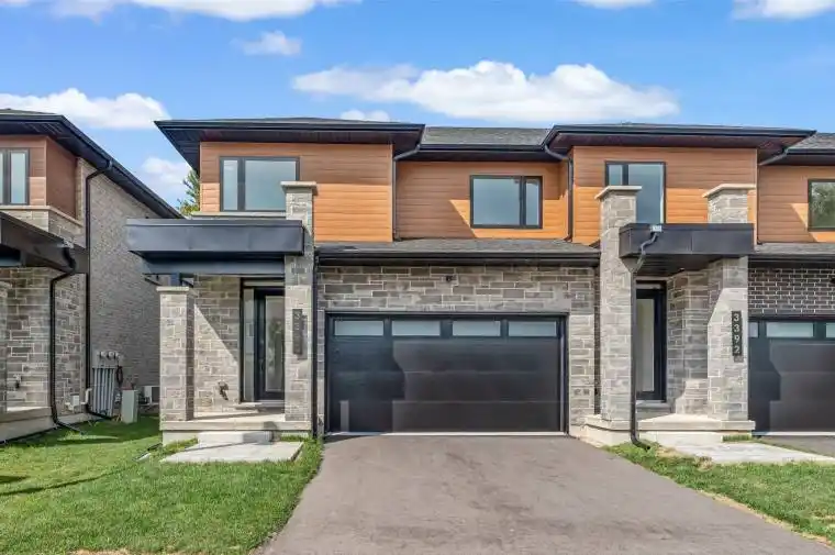 Brand-new executive town home never lived in! This stunning 1,799 sq. ft. home is situated in an exclusive enclave of just nine units, offering privacy and modern luxury. Its sleek West Coast-inspired exterior features a stylish blend of stone, brick, and aluminum faux wood. Enjoy the convenience of a double-car garage plus space for two additional vehicles in the driveway. Inside, 9-foot ceilings and engineered hardwood floors enhance the open-concept main floor, bathed in natural light from large windows and sliding glass doors leading to a private, fenced backyard perfect for entertaining. The designer kitchen is a chefs dream, boasting white shaker-style cabinets with extended uppers, quartz countertops, a stylish backsplash, stainless steel appliances, a large breakfast bar, and a separate pantry. Ideally located just minutes from the QEW, 407, and Burlington GO Station, with shopping, schools, parks, and golf courses nearby. A short drive to Lake Ontario adds to its appeal. Perfect for down sizers, busy executives, or families, this home offers low-maintenance living with a $296/month condo fee covering common area upkeep only, including grass cutting and street snow removal. Dont miss this rare opportunity schedule your viewing today! Tarion Warranty!
