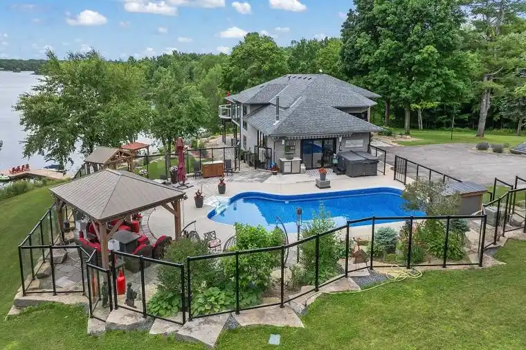 Welcome to Casa Pinot, a breathtakingly reimagined waterfront estate nestled on Black Lake, showcasing 377 feet of natural shoreline and 2.5 acres of professionally landscaped privacy. This custom-designed and extensively renovated home offers nearly 4,000 sq ft of luxurious living space across multiple levels, blending timeless design with exceptional functionality. Step into a dramatic entry leading to a great room with soaring ceilings, heated flooring, and a striking floating staircase, all framed by expansive windows that flood the space with natural light. The open-concept kitchen is a perfect balance of style and performance, flowing effortlessly into spacious dining and living areas with beautiful panoramic lake views. Walkout to the patio overlooking a private resort-style setting. Outdoors, enjoy a heated inground pool, hot tub, firepit lounge, and a charming lakeside bunkie for guests or quiet retreat. Expansive windows in the family room overlook the landscaped pool area with extensive patio and seating areas. The main-level primary suite offers a spa-inspired ensuite with a soaking tub and walk-in closet. A second bedroom and full bath accommodate guests in comfort. The bright, walk-out lower level includes two additional bedrooms, full bath, home office, gym area, family room, and large laundry space. An oversized garage/workshop provides ample storage. Whether you’re a full-time resident, seasonal owner, or remote professional seeking sanctuary with style, this home offers the flexibility and infrastructure to support your lifestyle goals. With over $1.1 million in renovations you can only appreciate the beauty in person. Located minutes from Perth, yet worlds away this is the legacy estate you’ve been waiting for.