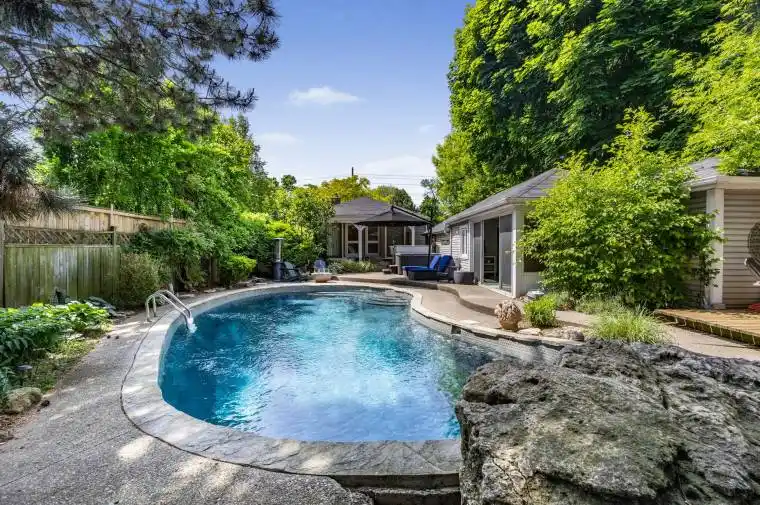 Nestled within the tranquil Bronte neighbourhood, this well-maintained bungalow with a private front porch presents a rare opportunity in Bronte Village. A one-of-a-kind find, boasting a sought-after 50′ x 150′ treed private lot, this property exudes charm and character. The heart of the home features a fabulous family room addition with a vaulted ceiling, enhanced by natural light streaming through the abundance of windows.Two bedrooms on main level with the primary bedroom overlooking the back gardens. Two full bathrooms in the home with main floor dining room plus the lower level has a large rec-room with a bar area and wood burning fireplace. Beyond the main residence, a delightful pool house invites relaxation, complemented by a large driveway offering ample parking for up to four vehicles. Step into the incredible Muskoka-like backyard oasis, complete with an in-ground saltwater pool and hot tub, surrounded by gorgeous gardens, mature trees, armour stone, deck, and exposed aggregate concrete a perfect stage for summer entertaining. With two gas lines, outdoor gatherings are a breeze. This property is a must-see to fully appreciate the blend of privacy, comfort, and entertainment potential it offers.