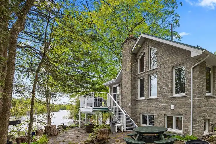 Just a short drive from downtown Kingston and a quick jaunt into Westport, nestled among more than 20 varieties of mature trees, on spring fed Buck Lake and in the Canadian Shield, this prestigious stone, raised bungalow is waiting for you to call home. The main floor boasts floor to ceiling windows and patio doors to the wrap around deck and clear, 180 degree view of Crown land including exclusive direct sight of the famous local landmark, Pulpit Island with the iconic “Devil’s Pulpit”. The lower level, which is a walk-out, has two additional bedrooms (that could be 3), a 4-piece bathroom, laundry closet, cozy rec room with propane fireplace and like upstairs, floor to ceiling windows and patio doors so that you never lost the view. You walk out into a three season space under the deck, here you’ll spend many nights playing cards/games. Just a few steps from the main house is a beautiful 4 season guest house, complete with a single/double bunk bed, toilet, sink and outdoor shower. Take the stone steps down to the crystal clear and deep shoreline, pop open the cabana and host the best dock party around! There is plenty of room on the dock for all sorts of activities and the original solid boat house is ready, waiting to house your watercraft of choice. The period style of the building’s living space (2,078 sq ft) is enhanced by artful, expansive and expensive landscaping of local stone and materials; patios, pathways, limestone steps, iron railings, border rock fences, 2 large rough cut board and batten pine sheds, with steel roofs to match the main house! Upgraded Septic system, Brand new Kohler-Generator, and Bunkhouse Cabin. This is a home that needs to be seen and experienced in person, so come see today!