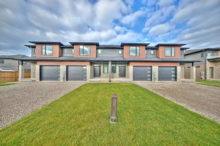 Welcome to Forestview Estates in Niagara Falls! This stunning end-unit townhome features 3 spacious bedrooms and 3 bathrooms, showcasing 9 ceilings, wide-plank hardwood floors, and an open-concept main floor with large windows that flood the space with natural light. The modern kitchen boasts quartz countertops, a centre island, and custom cabinetry extended to the ceiling. The kitchen flows seamlessly into the living and dining areas with access to your private fenced yard and deck. Upstairs, enjoy the convenience of second-floor laundry and a bright primary retreat complete with a walk-in closet and ensuite featuring quartz counters and a glass tiled shower. 2 more bedrooms and a 3rd bathroom with double vanity, quartz counter and tub/shower insert complete this second level. A separate side entrance to the unfinished basement is ready for you to make it your own, offers excellent potential for an in-law suite, rental income opportunity or extra living space. Ideally located near schools, parks, shopping, and quick highway access, this home blends modern finishes with functionality in one of Niagara’s most desirable communities.