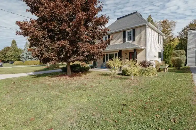 Welcome to this fantastic family home, where a charming covered front porch invites you inside. The thoughtfully designed layout features a cozy family room centred around a natural gas fireplace, flowing seamlessly into the dining room and a beautifully designed kitchen with heated floors. A spacious, fully insulated four-season sunroom across the back of the home offers versatile living space with in-floor heating, a mudroom, and a convenient powder room, and opens onto a deck with a remote awning perfect for outdoor entertaining. Upstairs, you will find three well-sized bedrooms and a large bathroom complete with a soaker tub, shower, and vanity. Set on a beautiful full town lot with mature trees, perennial gardens, and wonderful privacy, this property also includes a detached two-car garage and is just minutes from downtown Collingwood.