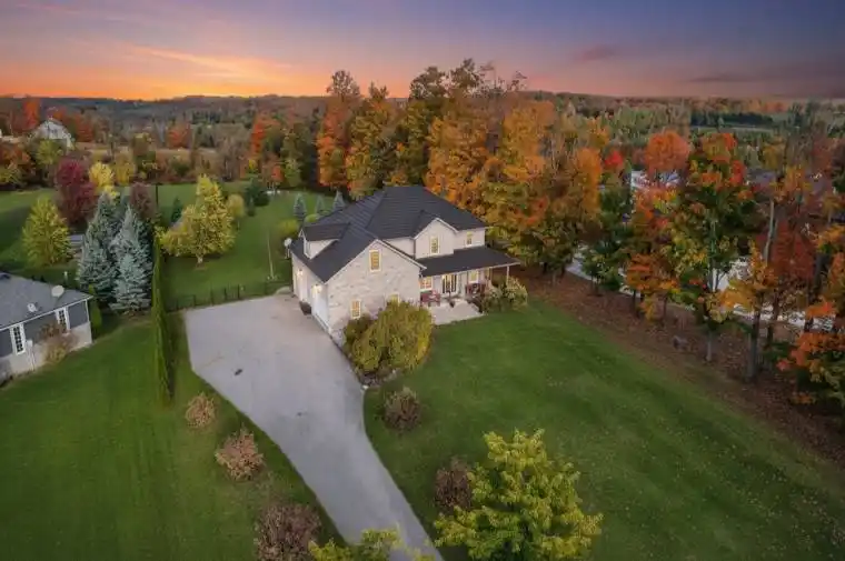 Tucked away on nearly 2 acres of private, tree-lined land, this one-of-a-kind custom home offers the ideal blend of luxury, space, and serenity. Surrounded by mature trees and cedars, the setting is peaceful and secluded, yet just minutes from all the essentials. With nearly 3,800 sq ft of beautifully finished living space, the home makes a statement from the moment you arrive. A paved driveway guides you to an oversized 3-car garage with convenient access to the laundry/mudroom-perfect for busy families. Step inside to a dramatic great room with soaring vaulted ceilings, a wood-burning fireplace, and floor-to-ceiling windows that bring the outdoors in. The kitchen is designed for both function and style, featuring stone countertops, a gas stove with hoodless venting, and a sunlit breakfast nook that flows into the outdoor entertaining space. On either side of the foyer, a formal dining room and a private office (or music room) offer flexibility. Upstairs, the primary suite feels like a private retreat, complete with a walk-in closet and spa-like 5-piece ensuite. Two more bedrooms share a luxurious full bath, and a cozy family room with a built-in office nook adds a bonus living space. The finished lower level is ideal for multi-generational living, with a 3-bedroom in-law suite, private entrance, full kitchen, and garage access. Outdoor living is a dream with a large back deck, a wrap-around front porch, a fire pit area, a vegetable garden, and fruit trees dotting the landscape. Backed by Braestone Golf Club and The Ktchn, and minutes to Horseshoe Valley, Bass Lake, Glen Oro Farm, Mount St. Louis Moonstone, and more. Just 10 minutes to Orillia and 20 to Barrie-this is luxury country living with city convenience.