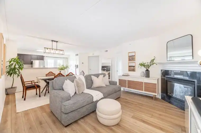 Bright, beautifully designed corner unit, thanks to the wraparound windows and south-facing views. Thoughtfully laid out and full of charm, this suite is nestled in a well-kept building with a welcoming, community feel. With two full washrooms, two bedrooms and a smart, open layout, the space is perfect for families, guests, or anyone who appreciates a little extra room. The oversized primary bedroom offers a private ensuite and generous windows, while the open-concept living and dining area, which includes a cozy gas fireplace, is made for both quiet nights in and easy entertaining. Off the kitchen, step into your private balcony and take in peaceful views of Sinclair Park. The building offers great extras as well, including a clubhouse with a gym and stylish party room. Commuting is a breeze with quick access to the highway and GO Transit nearby. Where comfort and style meets opportunity. Make this home yours! Includes one underground parking spot, a storage locker, and an additional surface parking space is available via permit by the property manager and at their discretion. Please see multimedia tour and floor plan. (41362190)