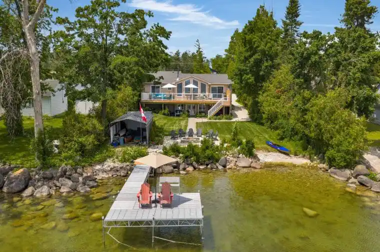 Don’t be deceived by this home’s modest roadside appearance-behind the front door awaits a private lakeside retreat offering over 2,700 sq. ft. of renovated living space. Ideal as a full-time residence or cottage getaway, this 2020 renovated waterfront property is just 20 minutes from Barrie and Orillia and minutes from Highway 11. Enjoy 81 feet of clean Lake Simcoe shoreline with a 72-foot dock and a shallow beach cove perfect for children and launching kayaks or paddle boards. Oversized glass doors on both levels frame stunning lake views as soon as you step inside. The upper level offers engineered hardwood floors, tongue and groove ceilings with pot lights, and an open living area centered around south-facing windows and a wood-burning fireplace. The kitchen features quartz countertops, a functional island, and upgraded LG appliances. Three bedrooms and two bathrooms include a primary suite with a custom closet, three piece ensuite, and private walkout. The lower level walkout includes a fourth bedroom, third bathroom, modern wet bar or pantry, and a laundry room. Vinyl flooring supports easy indoor-outdoor living, and a natural stone gas fireplace warms the spacious rec room. Step outside to a shaded patio leading to the 6-person Jacuzzi hot tub with lounger seating. Additional upgrades include full water treatment with UV and charcoal filtration, Rogers Ignite high-speed internet, smart-home features, new A/C (2022), new furnace with UV sterilizer (2021), new roof on house and garage (2020), 200-amp service, Generac generator, insulated triple garage with subpanel and heated workshop, invisible pet fencing, a 220V EV outlet, and two sheds, one with hydro. Move in and enjoy exceptional lakefront living.