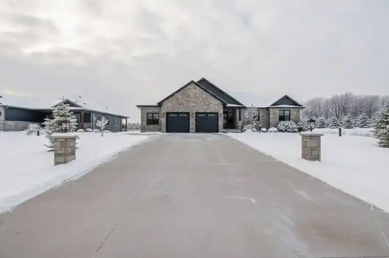 Some homes check a few boxes, this one checks them all. With over 4,000 sq ft of finished living space across the main floor and lower level, this custom-built bungalow offers a level of space and flexibility rarely found. Ideal for families who want room to live, work, entertain, and grow. Set in Allenford’s sought-after Nickason Drive subdivision, it blends a peaceful country feel with unbeatable central convenience. Just 15 mins to Southampton, 20 to Owen Sound & Port Elgin, 40 to Bruce Power. Curb appeal stands out with full Shouldice stone exterior, stamped concrete porch, triple-wide driveway, modern entry and oversized 2.5-car garage. Inside, the open-concept layout is refined and functional. The kitchen is a showpiece with quartz counters, contrasting white and white oak cabinetry, brick-style backsplash, black stainless appliances and farmhouse sink overlooking the yard. A walk-in butler’s pantry adds bonus storage and prep space, with a stylish 2-pc bath tucked nearby. The living room features a propane fireplace with stone surround, custom built-ins and glass doors to the backyard. The primary suite offers a spa style ensuite and walk-in closet with laundry nearby. Two additional bedrooms share a beautifully finished 4-pc bath.The fully finished lower level impresses with 9-ft ceilings, in-floor heat, custom media wall and space for a golf simulator, gym or play zone, plus a 4th bedroom, office/guest room and designer 3-pc bath. Outside, relax on the covered 16′ x 8′ patio or soak in the hot tub under the gazebo. The fenced yard backs on to open space for privacy and peaceful views.A rare, best-of-the-best offering – homes like this don’t come along often.