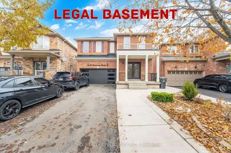 Welcome to 23 Personna Circle, proudly situated in the prestigious Estates of Credit Valley, on a cul de sac location. one of Brampton’s most sought-after neighbourhoods. This stunning, fully upgraded residence offers exceptional craftsmanship, thoughtful design, and a legal finished basement with a separate entrance. Double-door entry leads into a bright, elegant main floor featuring 9 ft ceilings, hardwood floors, pot lights, and separate living and family rooms, ideal for both entertaining and everyday comfort. The cozy gas fireplace creates a warm focal point in the family room. The gourmet kitchen boasts stainless steel appliances, granite countertops, ample cabinetry, and an open, functional layout that will impress any home chef. A beautiful oak staircase leads to four spacious bedrooms, including a luxurious primary suite with a 5-piece ensuite and walk-in closet. 3 washrooms upstairs for convenience and comfort.. The professionally finished legal basement offers excellent versatility with its own private entrance, multiple rooms, full washroom, and large living space. Outside, enjoy a meticulously maintained backyard with a concrete patio, with no neighbours behid, perfect for gatherings and summer relaxation. The extended concrete driveway allows parking for up to 6 vehicles, plus convenient garage-to-house entry.
