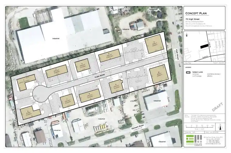 Rare opportunity to own a fully serviced, high-exposure industrial lot in a prime commercial corridor on High Street-ideally located between Home Depot and Home Hardware. This high-traffic location offers exceptional visibility and accessibility, surrounded by established retail, service, and trade businesses.The development features privately owned, M5-zoned industrial lots, each sold individually and fully serviced, providing flexible options for owners or investors. Strategically situated within Collingwood’s Official Plan growth area, this site offers long-term value and excellent positioning for a wide range of industrial or service-commercial uses. Town water, sanitary sewer, three-phase hydro, and high-speed internet are available (buyer to confirm service connection requirements). This is an ideal opportunity to secure your own serviced industrial lot in one of Collingwood’s fastest-growing commercial districts-perfect for contractors, trades, warehousing, service-commercial users, or investors seeking ownership in a high-demand location.