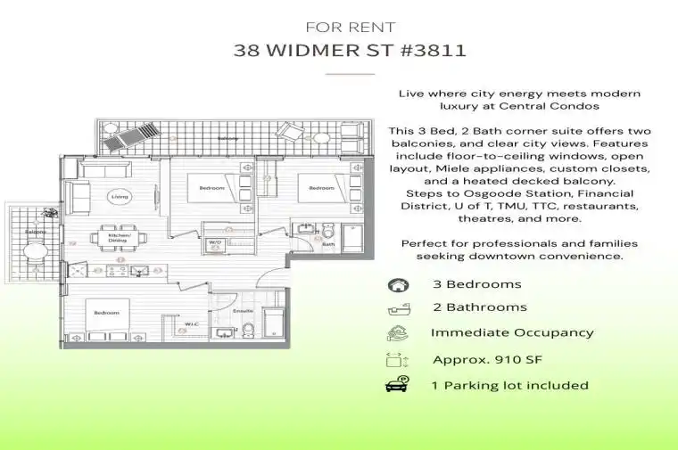 Experience modern downtown living at Central Condos, 38 Widmer. This spacious 3-bedroom, 2 bath corner suite offers two balconies, and city views. Thoughtfully designed with an open layout, Miele appliances, organized closets, front-load laundry, and heated composite balcony decking. Central is a true tech-forward building featuring, refrigerated parcel storage, and professional-grade co-working spaces. Located in the heart of the Entertainment District-steps to TTC, Osgoode Station, Financial District, U of T, TMU, restaurants, theatres, and major attractions. Ready for immediate occupancy.