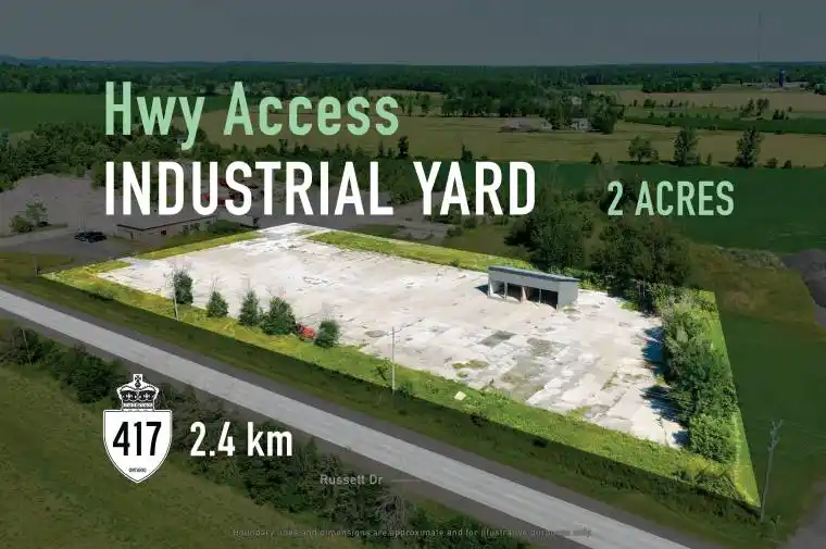 FOR LEASE: Located at 482 Russett Dr in Arnprior’s industrial corridor, this 2-acre light industrial parcel offers a mostly concrete yard, partial frontage fencing, and a 4-bay open garage structure (10ft x20ft bays, 10ft clear height). Hydro is available. Suited for outdoor storage, fleet parking, or contractor use. Immediate possession. Minutes from the Hwy417/17 junction with direct access to Ottawa and the Upper Ottawa Valley. Gross lease; utilities and ground maintenance are the tenants responsibility.