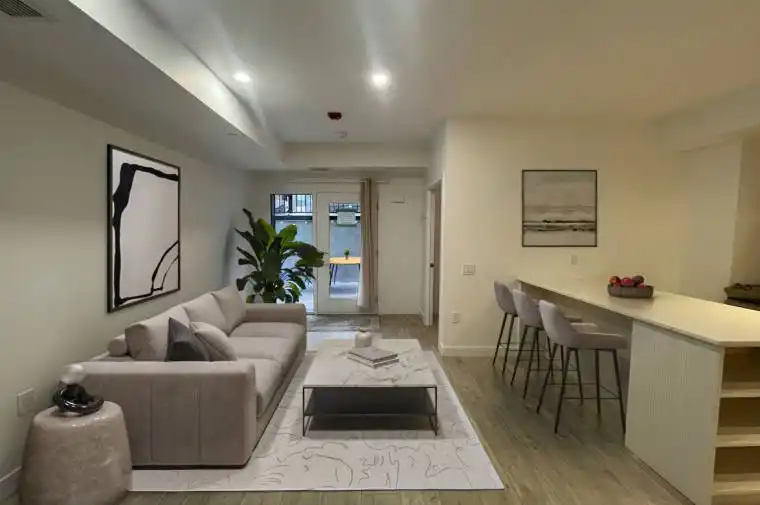 Experience Modern Living In This Newly built 1 Bed + Den Suite w/ Large 215 square foot patio. Boasting 9′ Ceilings, Modern Finishes, and light wood Laminate Flooring throughout. The modern kitchen features Full Sized Stainless Steel Appliances, backsplash, and Eat-in Kitchen Island with ample storage space. The Open Concept Den can be used as the perfect home office space, or an extension of the living/dining area. Situated In A Great Location Close to Public Transit, Shopping, Lake Ontario, Beaches, Schools, A Community Center, And Plenty of Great Restaurants. Underground Parking Space and storage locker included! Tenant is responsible for all utilities. Photos have been virtually staged