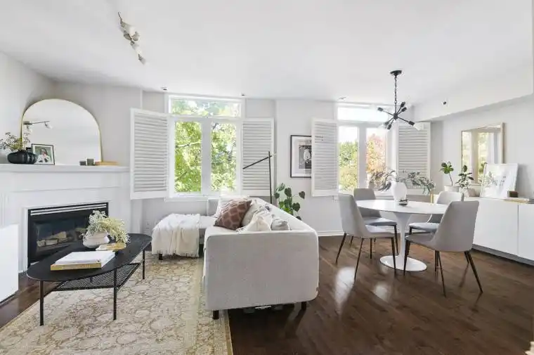 Tucked along a quiet, tree-lined street just steps from Trinity Bellwoods and Queen West one ofToronto’s most vibrant and coveted corridors this beautifully designed two-bedroom condo townhome delivers an effortless blend of comfort, style, and ease. Behind its classic red-brick facade lies a space that feels more like a home than a condo. Thoughtfully laid out across multiple levels, its perfect for a couple or first-time buyer seeking room to grow. The main floor offers open-concept living, dining, and kitchen areas with a convenient powder room ideal for entertaining or unwinding. Oversized windows bathe the space in natural light, while the kitchens two-tone cabinetry (white uppers and deep blue lowers), Caesarstone countertops, and subway tile backsplash lend a touch of modern refinement. Upstairs, you’ll find a bright four-piece bath and two generous bedrooms. The second bedroom, currently a charming nursery with built-ins, could easily serve as a guest room or home office. The primary suite offers ample closet space and a peaceful, sunlit retreat. On the top floor, a spacious rooftop terrace provides a rare urban escape expansive enough for lounging, dining, or simply enjoying sunset cocktails under the stars, surrounded by treetop views. Residents also enjoy the use of the gym and other amenities at 954 King. Just moments from Trinity Bellwoods Park and some of the city’s most celebrated cafes, restaurants, and shops, yet quietly tucked within a family-friendly pocket, this home strikes a perfect balance between urban energy and neighbourhood calm. A rare offering of scale, character, and setting city living, beautifully composed.