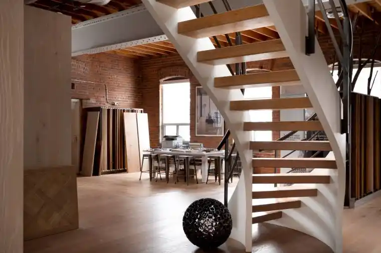 Set within a brick and beam Georgian-style industrial building originally constructed in approximately 1930 as the head office of Purity Flour Mills, 287 Macpherson Avenue is a boutique office building shaped by heritage proportion, material presence and architectural resonance, adapted for contemporary use. Offering approximately 3,301 square feet of distinctive, studio-scale workspace arranged across a main level and mezzanine, Suite 303 is currently configured as a showroom and working studio. Exposed brick, custom wide-plank wood flooring, and a measured interplay between structure and light establish a calm, grounded atmosphere. Large south-facing, industrial-scale windows and overhead skylights bring natural light throughout the space. A sculptural staircase connects the main floor to the mezzanine above, where the pitched roofline, exposed joists and skylight glazing introduce a quieter, more intimate spatial rhythm, while remaining visually connected to the space below. This intimate 271 square foot upper level is ideal as a private office or focused work area. The layout offers adaptability, whether used as an open-format studio, divided into complementary workspaces, or demised to a smaller footprint, while maintaining a cohesive architectural presence throughout. Defined by volume, materiality, and intent, this space is well-suited to design-led practices, architecture and interiors firms, material or product showrooms, and principal-led offices for practices that see workspace as an integral reflection of how they operate and engage clients.