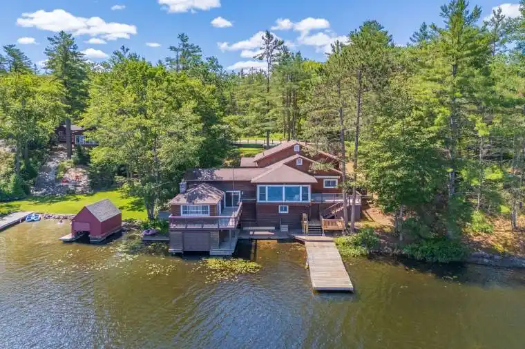 Welcome to a rare family retreat on the shores of Pine Lake. Cherished by one family, this year-round cottage is ready for new memories to be made. With 6 bedrooms and 4 bathrooms, there is space for everyone kids, grandkids, and friends alike. The spacious main floor living, kitchen, and dining areas invite laughter, long dinners, and evenings spent together. A front sitting room, framed by a large picture window, invites uninterrupted lake views, making it the perfect spot for morning coffee. For added convenience, there is a separate laundry room as well as the comforts of a furnace and central AC, ensuring ease and comfort no matter the season. Outside, you’ll find just over 170 feet of waterfront, with deep water off the dock, perfect for swimming, boating, and waterfront fun. The attached single-slip boathouse with accommodation above offers additional guest space or a private lakeside escape. At the same time, an inclinator from the parking area to the main entrance ensures easy access for everyone. The property also includes ample parking and a detached 2-car garage. A separately deeded 8+ acre parcel across the road offers potential for future development opportunities, adding even more value and flexibility to this special package. Located minutes from Gravenhurst and a short drive from the GTA, this beloved cottage is a solid, well-maintained building just waiting for a new family to bring their vision and create the next chapter of its story.
