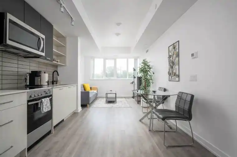 (Open house every Sat/Sun 2-4pm by appointment only.) Welcome to Stockyard Condos by Marlin Spring Developments nestled in the heart of The Junction a prestigious Toronto neighbourhood. Located on the 3rd floor with a South exposure, this spacious 2 bedroom suite offers 607 sq ft of living space, tons of natural light, modern finishes, laminate flooring throughout, ensuite laundry and an open concept balcony to unobstructed city views. The inviting open-concept living and dining areas are perfect for relaxation and entertainment. Enjoy the chef’s kitchen that’s equipped with contemporary stainless steel appliances, quartz countertops, and a stylish backsplash. The spacious bedroom features a sizeable closet and a walk out to balcony. The second bedroom features sliding doors and convenient closet space. The unit comes with 1 parking space and 1 locker. Building amenities include a 24-hr concierge, gym/exercise room, party/meeting room, outdoor terrace with BBQ area, visitors parking, electric car charging stations, games room and more. Conveniently located near TTC public transit, Stockyards Village, grocery & shopping plazas, restaurants, cafes, parks, banks & other local area amenities. Building allows short-term rentals. Vendor Take Back (VTB) is available.