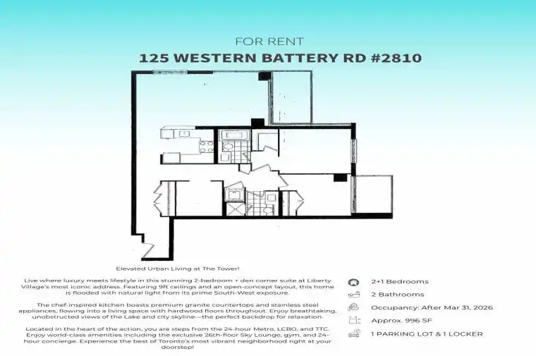 125 WESTERN BATTERY Road Unit# 2810, Toronto C01, Ontario M6K 3R8 is For Rent and has a listing price of 3,700. The property is located in the Liberty Village neighbourhood . It's been on the website for 3 Days.
