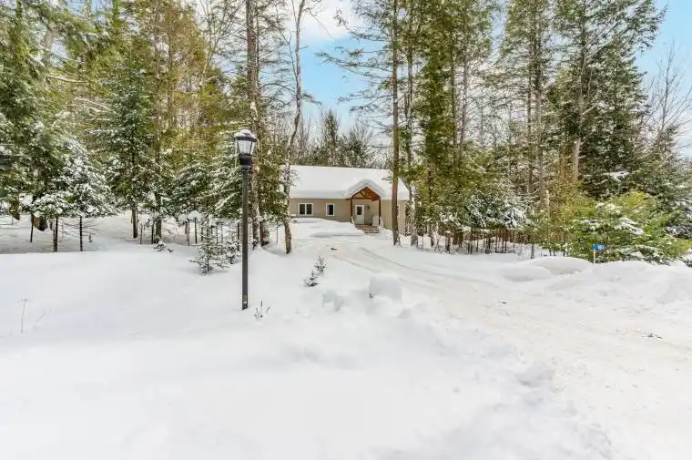 Welcome to this thoughtfully designed 2025 custom bungalow, offering approximately 1,200 sq.ft. of well-planned living space and the perfect blend of modern comfort with an in-town rural feel. The main floor features a bright, open-concept living, dining, kitchen area, highlighted by vaulted pine ceilings and abundant natural light. The custom kitchen is finished with quartz countertops and quality cabinetry, flowing seamlessly into the main living space-ideal for everyday living and entertaining. Durable luxury vinyl flooring runs throughout the main level, complemented by spacious bedrooms with large closets. The primary bedroom offers a walk-in closet and a private 4-piece ensuite, while a second 4-piece bathroom and convenient main-floor laundry complete the level. Additional quality finishes include North Star windows, an asphalt shingle roof, and a welcoming front deck. At the rear, enjoy a 12′ x 12′ pine screened-in room with direct access to the backyard-perfect for relaxing and enjoying the natural surroundings. Full ICF foundation and features a bright walk out basement with oversized windows and a patio door, allowing for excellent future living potential. The basement is partially finished, with electrical completed, partial drywall installed, and rough-in for a third bathroom already in place. Mechanical systems include a propane furnace, owned hot water tank, 200 AMP panel and HRV system. Set on a beautifully treed lot, the property backs onto a natural escarpment, creating a private & peaceful backyard. Located on a municipally maintained road with underground hydro, phone, and internet, and accented by stylish street lanterns, this quiet dead-end cul-de-sac offers minimal traffic and a strong sense of community. All within walking distance to Haliburton Village, surrounded by custom homes, and designed to preserve a true rural atmosphere while still enjoying the convenience of town amenities.