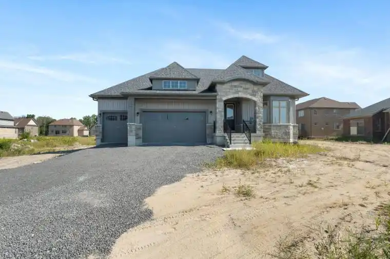 Stunning Brand New Never Lived In, 5 bed 4 bath Bungaloft. Modern & Sleek Kitchen with High End Black Stainless Steel Appliances, Oversized Quartz Kitchen Island & Breakfast Bar, Backsplash, & Pantry room. Open Concept to Eat-in Kitchen with walkout to 220 ft PREMIUM LOT. Must See Upper Level Loft Overlooking Great Room with 18 foot Vaulted Ceilings and Grand Portrait Windows and fireplace. Main level Primary room with 6 pc ensuite with all glass shower walk-in shower and standalone soaker tub, walk-in closet, double door walk out to yard. Main floor laundry and Mudroom. 10 parking spaces including 3 car garage. Home is under Tarion warranty. **EXTRAS** Largest Vineyard Floor Plan. 2700+ Square Feet. $$$$ Upgraded finishes. High End Appliances. Hardwood Floors and Hardwood Stairs. Builder to lay new grass, pave 7 car driveway + plant trees.