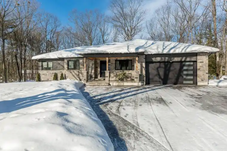 Welcome to refined beachside living in the heart of beautiful Tiny Township. This exceptional custom-built ranch bungalow, completed in 2021, is thoughtfully positioned on a private, treed 100 x 150 ft lot where every detail reflects uncompromising quality and craftsmanship. The striking exterior showcases an elegant blend of stone and Maibec siding, anchored by an impressive 42′ fiberglass front door. A generous covered front porch and an expansive 600 sq ft covered wraparound deck-complete with pot lights and tongue-and-groove ceiling-create an inviting space for year-round enjoyment. Inside, nearly 2,100 sq ft of impeccably finished living space offers timeless sophistication. Rich oak hardwood floors flow throughout, complemented by soaring 10′ ceilings in the living area and 9′ ceilings elsewhere, heated bathroom floors, and 8′ interior doors. The stunning designer kitchen is a true showpiece, featuring an oversized centre island, gas range, 48″ upper cabinetry, and a charming bay window overlooking the serene backyard. The open-concept living and dining area is perfect for entertaining, highlighted by a gas fireplace and double sliding patio doors that seamlessly connect indoor and outdoor living. The luxurious primary retreat offers a walk-in closet, spa-inspired 4-piece ensuite, and private access to the deck through additional sliding doors. The expansive 1,900+ sq ft unfinished basement with bathroom rough-in presents endless potential for customization. Additional conveniences include inside entry from the garage to the laundry room. Ideally located within walking distance to two pristine sandy beaches, minutes from the local marina, and a short drive to Awenda Provincial Park and Midland, this remarkable home offers the perfect blend of tranquility, luxury, and lifestyle. Whether as a refined cottage retreat, elegant downsizing opportunity, or forever family home, this is beach living at its finest.
