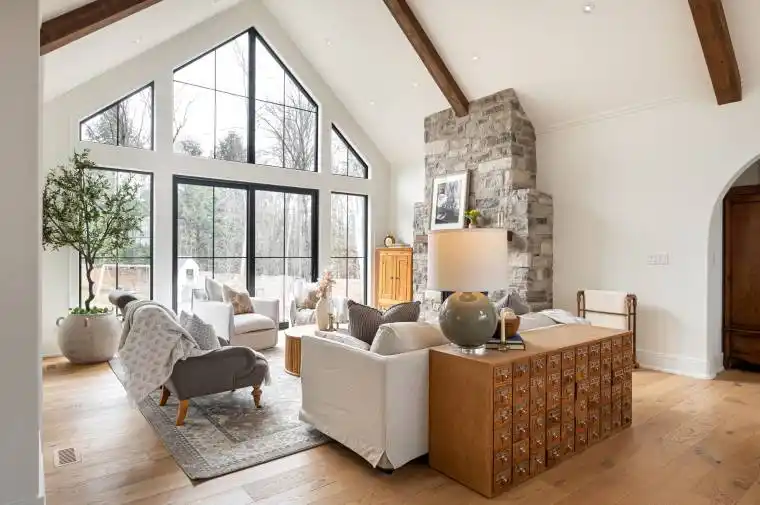 This exceptional high-end bungalow blends the charm of a European villa with modern luxury. Set well back from the road and approached by a circular driveway, the home boasts a striking exterior with wood siding, vertical board and batten, painted brick accents, and arched doorways. Inside, the kitchen is a masterclass in design, featuring an oversized island with a prep sink, panel-front appliances, and a stunning Elise propane range with pot filler. A walk-in pantry offers seamless storage. Vaulted ceilings in the kitchen and living room enhance the sense of space, while a propane stone fireplace anchors the open-concept design. A full wall of windows opens to an exquisite outdoor living area: a custom hexagonal stone patio surrounding a beautiful pool and mostly level, fully fenced backyard. The screened Muskoka Room with a wood-burning fireplace provides an inviting retreat, while the adjacent dining room is ideal for entertaining. The private bedroom wing includes two spacious guest bedrooms sharing a 5-piece Jack and Jill bathroom, and the rear-positioned primary suite offers serene backyard views. Its spa-like ensuite features a freestanding tub, glass-enclosed shower, and double vanity, while the walk-in dressing room provides ample storage. The opposite wing includes a large laundry room with folding surface, drying rack, and stylish laundry sink, as well as a mudroom with built-in storage and access to the heated double garage, currently a workshop but easily converted. The lower level offers a generous rec room, two additional bedrooms, and a 3-piece bathroom. A whimsical playhouse under the stairs adds charm, while a spacious storage room and tidy utility area complete the space. A rare find crafted with impeccable design, this home is a perfect blend of style and functionality.