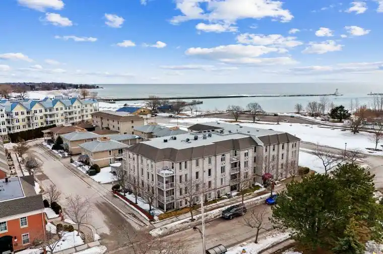 Waterfront living with breathtaking views of Lake Ontario and over 1,350 square feet of bright, comfortable space. This two-bedroom condo showcases full waterfront views and an open living and dining area featuring a carpet-free layout, crown moulding, a cozy fireplace, and a walkout to a private balcony overlooking the water. The kitchen is both functional and inviting, complete with a window over the sink, ample counter and cabinet space, and matching appliances. The spacious primary bedroom is a peaceful retreat, featuring multiple oversized windows that capture the stunning waterfront views, an incredible way to start each morning, and a private ensuite bathroom. A guest bedroom and full guest bathroom provide a comfortable space for visitors. In-suite laundry adds everyday convenience. Step outside to enjoy the patio with beautiful views of Lake Ontario. Located just steps from downtown amenities, the marina, and Cobourg Beach, with easy access to Highway 401, this condo offers stylish, carefree coastal living in an unbeatable location.