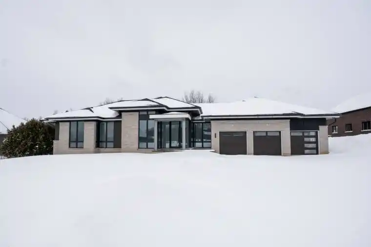 Welcome to 130 Dale Crescent, a modern bungalow set on a private 1.5-acre lot backing onto a protected forest. Large floor-to-ceiling windows, vaulted features, and heated tile surfaces create a bright, open, and calming atmosphere throughout the main living spaces.The kitchen offers high-end built-in appliances, quartz surfaces, custom cabinetry, and anisland designed for both cooking and gathering. A separate walk-out pantry adds freezer andcooling drawers for extra storage and prep. Warm hardwood, solid core doors, built-in speakers, and smart-home wiring complement the home’s clean, contemporary feel. A spacious family room with a gas fireplace, exposed steel accents, and views into the forest creates an inviting place to unwind. A bright front office with southern exposure provides a comfortable work space.The bedroom layout provides privacy and comfort, including a generous primary suite with a 5-piece bath, walk-in closet, and a private walk-out. Additional bedrooms are positioned near their own bathrooms, offering flexibility for family or guests.The walk-up lower level adds nearly 3,000 sq. ft. of extra living space, featuring a recreation area, wet bar, gym space, bedroom with walk-in closet, and a bathroom designed to accommodate a steam shower – along with storage areas and a future theatre room space. A covered patio extends the living space outdoors with heating rough-ins, wiring for A/V, and abuilt-in BBQ area. A full-home generator, hydronic in-floor heating, and high-efficiency mechanical systems add ease and comfort year-round. All set in a quiet estate enclave just minutes to Hwy 400, nearby golf, local farm markets, and Bradford’s everyday amenities.