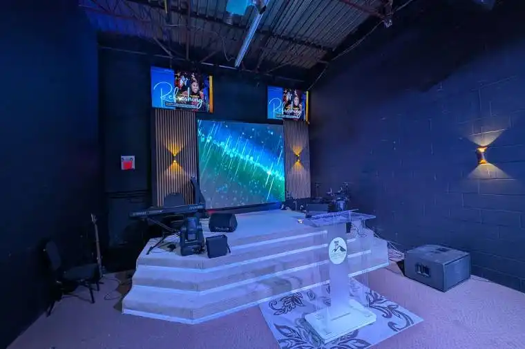 Completely BUILT-OUT CHURCH Space featuring Main Stage, Carpeted Flooring, 4 stalled bathrooms (2 Male & 2 Female), Large Great Church Hall w Rear AV-Media Station, Front Kitchenette, Children’s Play/Education Room, Storage Room, Ceiling Fans, Sprinkler & HVAC System, Add your own Lighting & Audio-Visual Equipment (Projectors/TVs) and the space is highly suitable for your mid-sized congregation’s needs.
