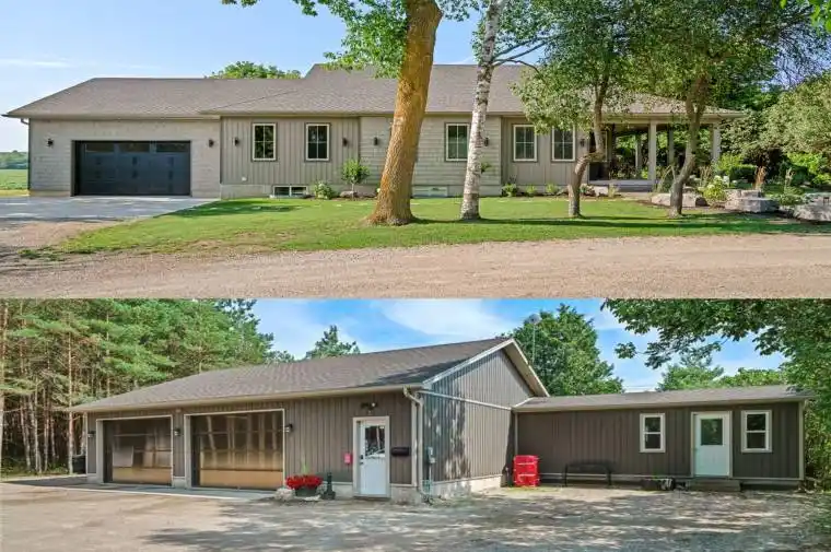 A Must See! This 4 year new, 1800 sq ft bungalow has a full finished basement, making a total of over 3300 sq ft of living space and a 2 car attached garage! It sits on 1 acre and is located within walking distance to the town of Durham. BONUS: a 36×40, 2 bay shop with 12×8 translucent doors and openers and is fully serviced with hydro, gas, a/c, water, and a holding tank. Attached to the shop is a 12×24 “sitting” room that has heat, a/c and a 2 piece bathroom with entrance to the shop and entrance to the yard/large parking lot. The home has 3+ bedrooms and 3 full bathrooms. One master bedroom is located on the main floor with large ensuite and custom walk-in closet. Two more bedrooms are located in the basement with one being a second master bedroom with large ensuite and walk-in closet. Potential for an IN LAW SUITE! The fourth room in the basement could be used as an additional bedroom, workout room, office space, etc. The home features a Sommers natural gas backup generator that powers the whole home during outages, Central A/C, and an open concept design with vaulted ceiling in the kitchen and loads of windows to let natural light in. Kitchen features custom built Barzotti cabinets in white, shaker-style with stainless steel appliances. On the main floor you will see laundry, a gas fireplace and a must see sitting room with wrap-around windows overlooking the backyard and field. The attached 2 car garage is wired and ready for an EV Quick-Charge station and has openers on the front bay door as well as on the rear translucent bay door leading to the backyard. Steps from inside the garage lead to the utility room/basement. Last but not least, this property has a beautifully landscaped yard with armour stone, a poured concrete front walkway and a “secret” garden with pathways and perennials throughout the bush that separates the house from the shop. Come and see for yourself!