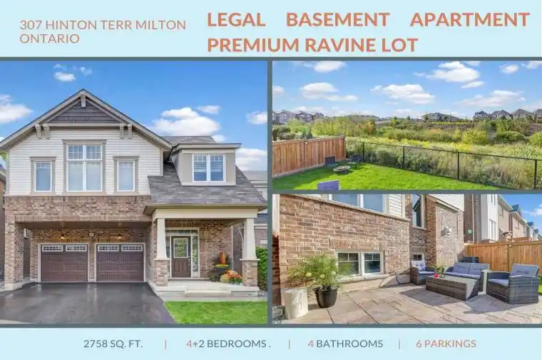 Presenting Bright, Sunny & Spacious Double Car Garage Fully Detached Home Featuring 4 Good Size Bedrooms + 2 Bed Basement Apartment (Legal) Backing onto Ravine (Premium Lot), 6 Parking, 9’ft Ceilings (Main Floor), Hardwood Floors, Round Staircase, Pot Lights, Gas Connection (Kitchen), Wainscoting, Epoxy Flooring (Garage) and the list of upgrades goes on. No Sidewalk. Extra Income coming from basement ($2000). Top School Zone St. Scholastica Catholic Elementary School (0.26km away), Boyne Public School (0.58km away), Viola Desmond Public School (0.99km away), Anne J. MacArthur Public School (1.43km away). This unique property is hard to compare with others due to many features that are rarely offered together, such as a Premium Lot (no neighbors behind, assuring complete privacy), 6 Parking Spaces (2 in garage, 4 on driveway), and a Legal Basement Apartment (already earning $2000), which cuts your mortgage in half, making it more affordable than others