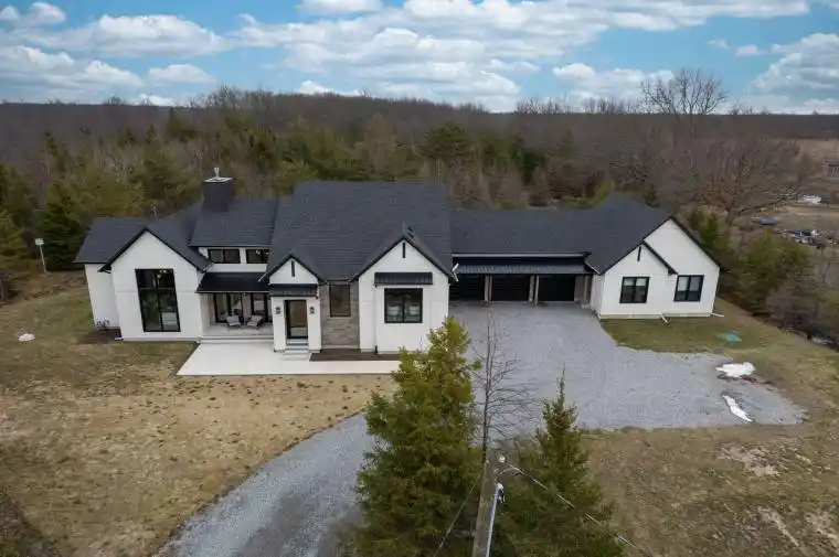 Set on nearly six scenic acres, this newly built bungaloft (2024) offers an exceptional blend of thoughtful design, quality finishes, and peaceful surroundings. Bright, open-concept living spaces are highlighted by soaring ceilings, oversized windows, and a seamless flow ideal for both everyday living and entertaining. The main living area features rich hardwood flooring, a striking gas fireplace with custom built-ins, and large sliding doors that open to a covered outdoor space, perfect for enjoying the property year-round. The kitchen is beautifully appointed with a mix of modern and natural elements, including contrasting cabinetry, granite countertops, gas cooktop, and a spacious butler’s pantry with ample storage. A well-designed dining area with built-in cabinetry adds both function and style.The main floor primary suite offers a private retreat, complete with its own fireplace, walkout access to the covered deck, a spa-inspired 5 pc ensuite, and a generous walk-in closet with custom organization. Additional main floor highlights include a powder room, laundry area, and a functional mudroom with built-in doggie bath. Upstairs, a loft-style layout provides added versatility with space for a home gym, an additional bedroom, and a full bathroom, along with a separate office featuring custom shelving. A fully self-contained in-law suite offers excellent flexibility for extended family or guests, featuring its own entrance, kitchen, living area, bedroom, laundry/mud room, and full 4 pc bath plus private fenced yard. Complete with a triple-car garage and a 4500-gallon cistern, this property delivers space, privacy, and modern comfort in a beautiful rural setting.