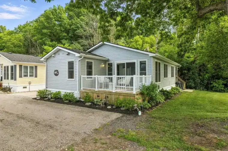 Live the resort lifestyle year-round in Unit #1 at Oriole Park Resort–a rare gem in Komoka just 10 minutes west of London. This vibrant four-season retirement community offers a peaceful, cottage-like setting and this 3-bedroom, 2-bathroom modular home is packed with features that make everyday living feel like a getaway. Inside, enjoy hand-scraped laminate floors, an open-concept living, dining, and kitchen area filled with natural light, plus generous closet space at the entrance. The kitchen features stainless steel appliances, tile backsplash, and ample cabinetry. Off the dining area, step onto a private back deck with patio space and a nearby propane hook-up–perfect for summer BBQs.The main 4-piece bathroom is equipped with built-in storage and a convenient stacked washer/dryer. All bedrooms are bright and spacious, with great closet space. One room functions beautifully as a sunroom, an office or third bedroom–your choice! From there, sliding doors lead to a cozy enclosed deck for even more outdoor enjoyment. The primary suite features vaulted ceilings, generous closet space, and 3-piece ensuite. Enjoy unobstructed outdoor views with a neighbouring lot that will remain vacant–offering extra privacy and serenity. A storage shed adds practical outdoor space for tools and gear and two parking spaces is a bonus! But what truly sets this home apart is the unmatched lifestyle Oriole Park offers: clubhouse amenities like a salon and spa, golf simulator, dog grooming station, fitness centre, pickleball court, event space, library, and a fully licensed bistro/bar with a pool table and darts. Stroll the beautifully landscaped grounds, complete with koi ponds, shuffleboard, an off-leash dog park, saltwater pool, community fire pit and garden, and BBQ areas. If you’re ready to downsize without compromise, Unit #1 is your ticket to affordable, stylish, and social living in one of the regions most unique communities.